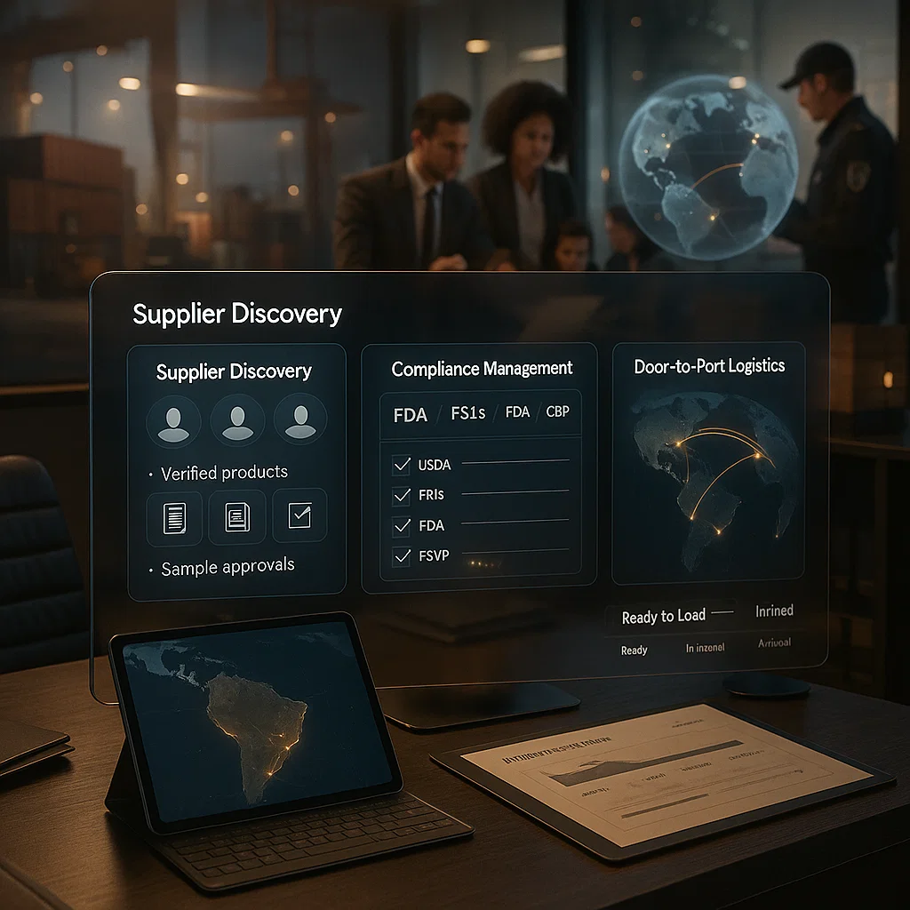 We connect U.S. buyers with certified suppliers in Brazil and Argentina. We handle supplier discovery, specs and pricing, U.S. compliance (USDA/FSIS, FDA/FSVP, CBP), and logistics/Incoterms to U.S. ports—through a single point of contact.